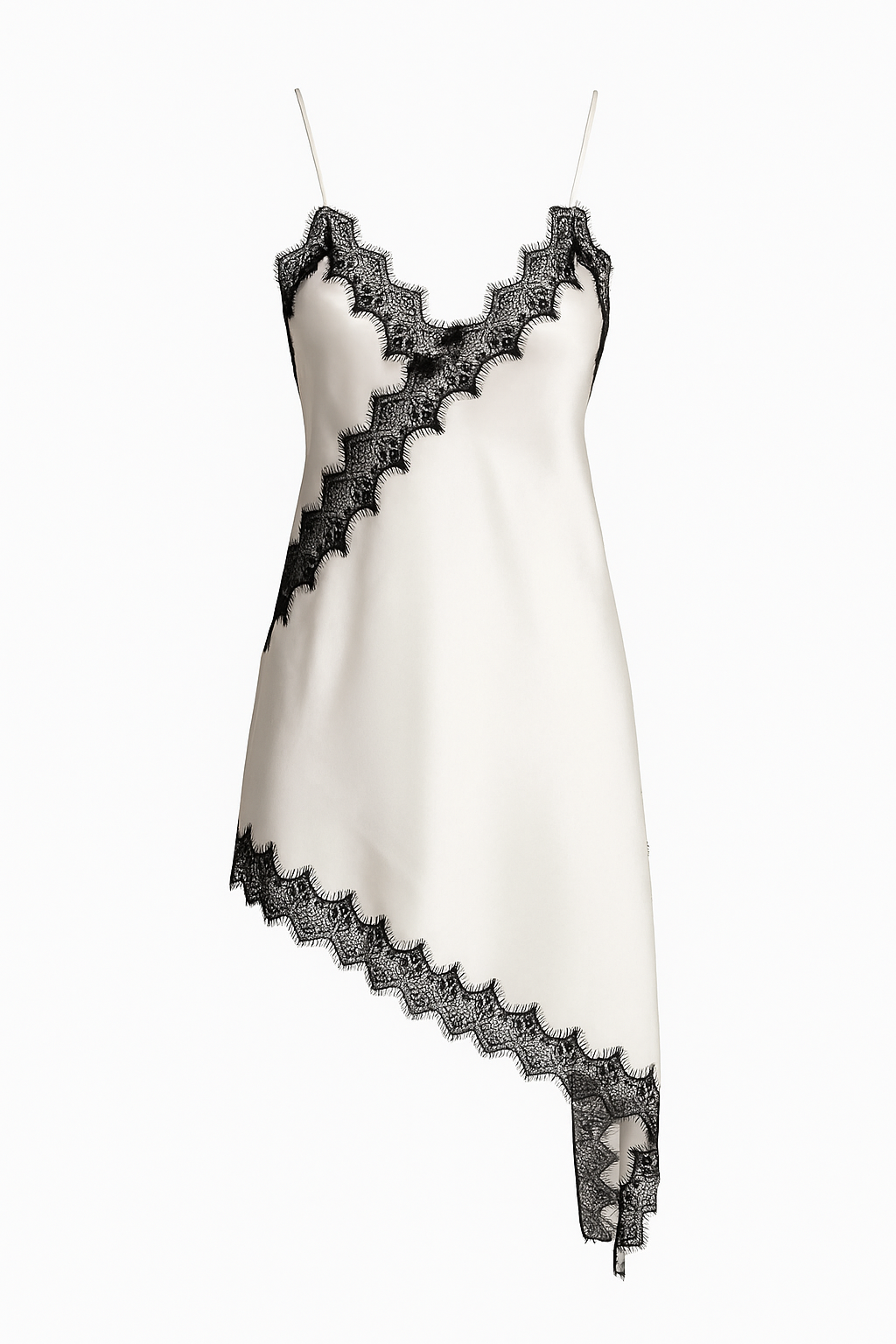 Top in raso lucido bianco con inserti in pizzo nero a contrasto dal taglio diagonale