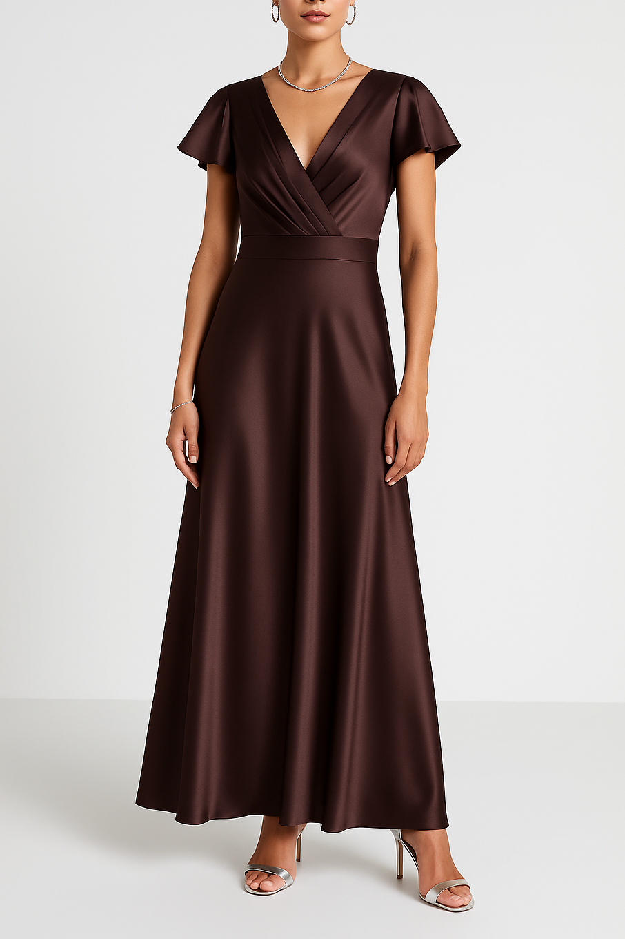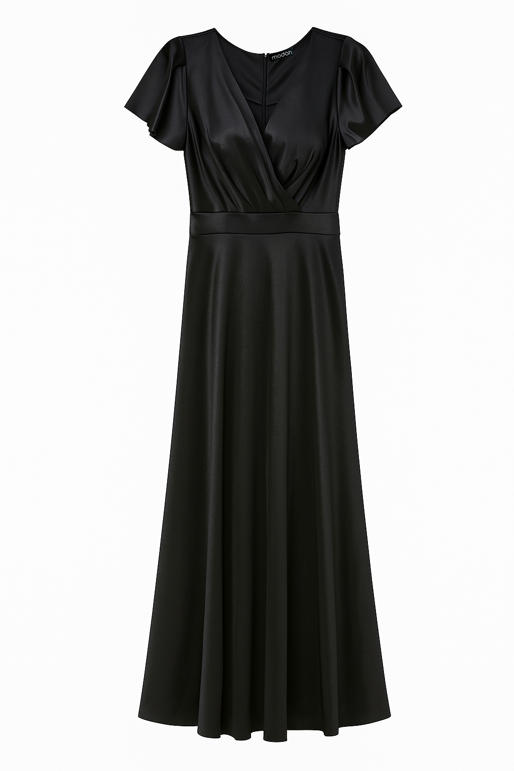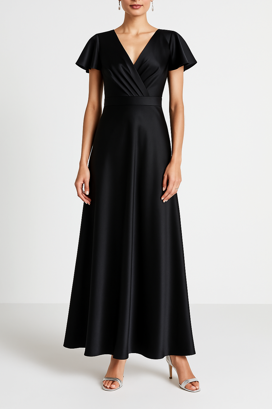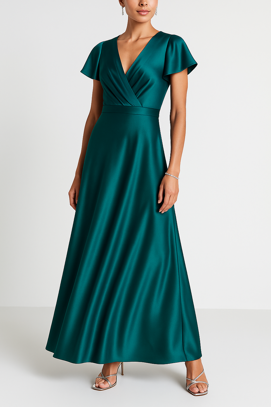 DESCRIZIONE: Abito in raso con scollo a V incrociato, cintura in vita e maniche a petalo. La gonna svasata cade morbida fino alla caviglia: elegante, luminoso, perfetto per cerimonie e serate.