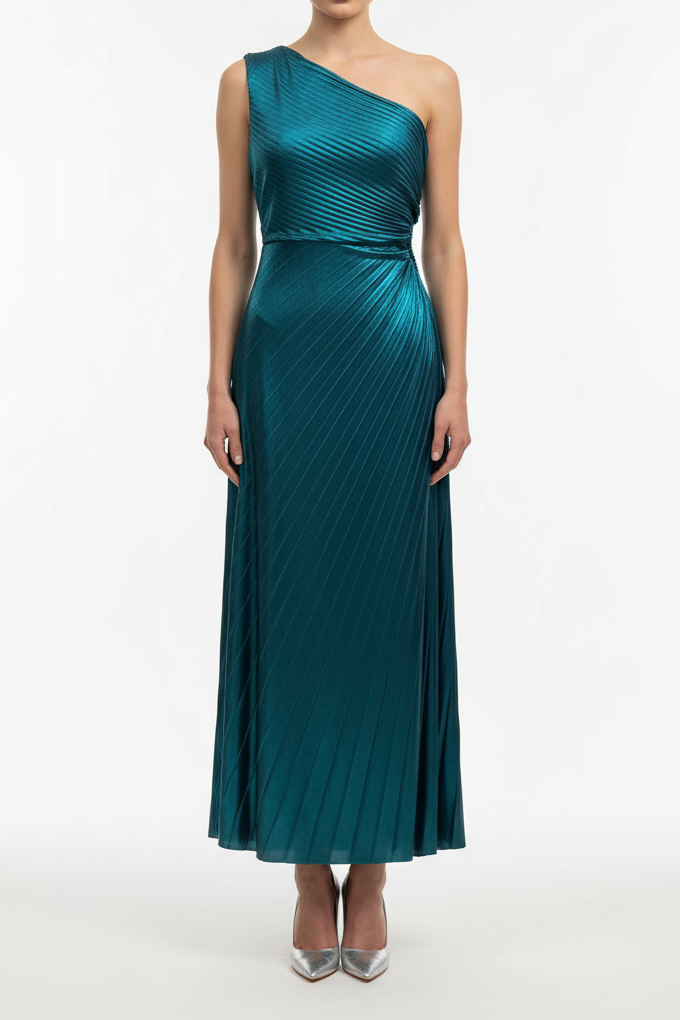 Abito plisse monospalla asimmetrico, con il dettaglio cut-out laterale aggiunge un accento audace e femminile.