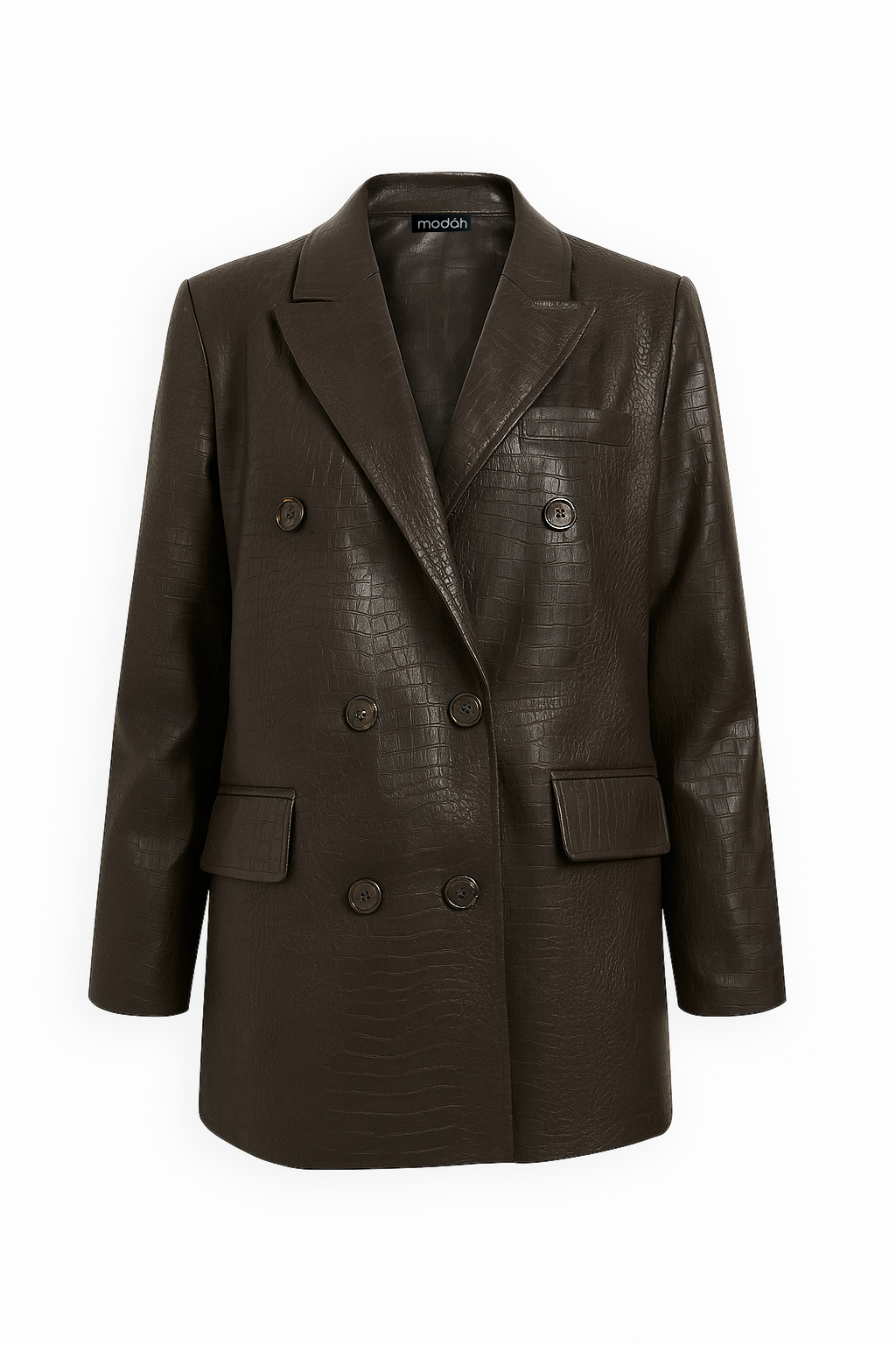 DESCRIZIONE: Blazer doppiopetto in eco-pelle effetto cocco dal finish semi-lucido. Vestibilità normale con revers classici e tasche con pattina.